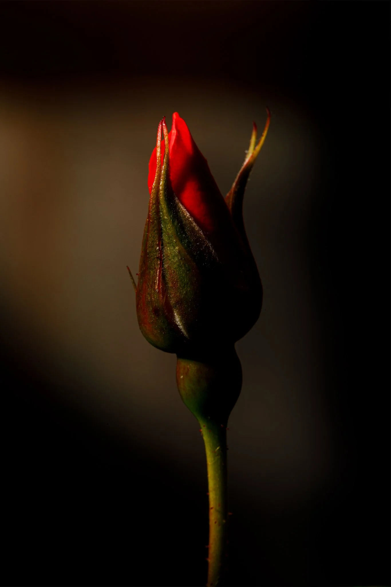 A close-up of a red rosebud against a blurred dark background. View fullsize